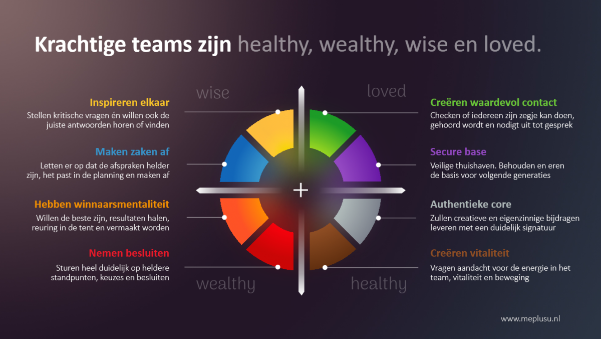ME+U is een ontwikkelplatform voor persoonlijke ontwikkeling, samenwerking en leiderschap. Het ME+U model kent vier kwadranten Healthy, Wealthy, Wise en Loved en acht drijfveren. Het maakt zichtbaar wat ieders persoonlijke drijfveren zijn en die van het team. Door de feedback die je ophaalt leer je te kijken naar jezelf door de ogen van anderen en de impact die je op hen hebt. Door de cultuurscan met elkaar in te vullen onderzoek je als team waarover jullie tevreden zijn binnen de samenwerking en wat nog beter moet.